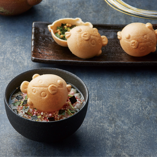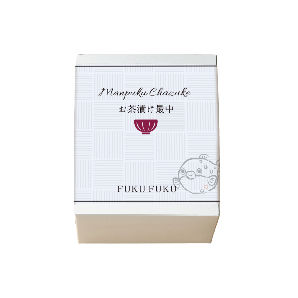 最中の中には、みつ葉やあられなどのうまみを加えた「梅」と「海苔」の2種類のお茶漬け。温かいご飯の上にのせて、お湯を注げばぷっくりとした愛嬌(あいきょう)たっぷりの「ふぐ」が浮かぶ「万福茶漬け」をお楽しみいただけます。古来より「ふく」と呼ばれ、福に通じる縁起の良い魚といわれている「ふぐ」。その姿に祈りを込めて、大切な人の幸せを願う癒しのギフトです。