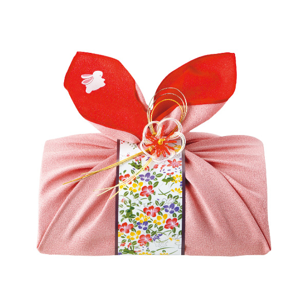 風格のある贈り物。風呂敷に包まれたかつお節ギフト「恋うさぎ」シリーズ。飛び跳ねることから「飛躍」、子だくさんから「豊穣」、長い耳から「聞き福」など、縁起の良いうさぎをモチーフにしたかつお節のギフトです。風呂敷きの中には焼津産本枯節鰹削りが4袋、鰹梅ふりかけ・わさびふりかけが各2袋、ふんわりたまごスープが2袋入っているので日々の食卓をより彩ってくれます。淡い桃色と赤を基調としたポップで可愛らしい風呂敷に包まれているので目上の方や若い年代の方への贈り物にも最適です。