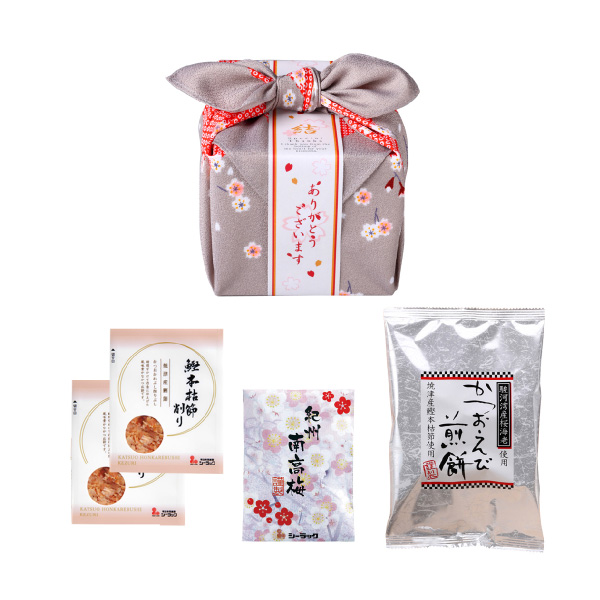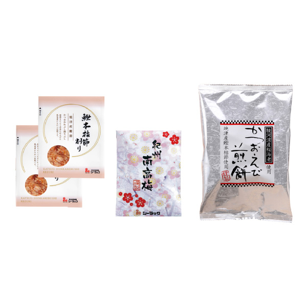 | 内容 | かつおえび煎餅×1袋、焼津産かつお本枯節削り×2袋、紀州南高梅×1袋 |