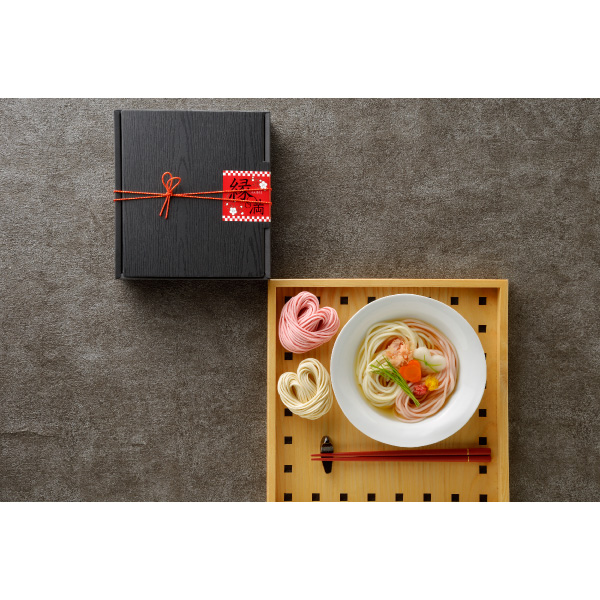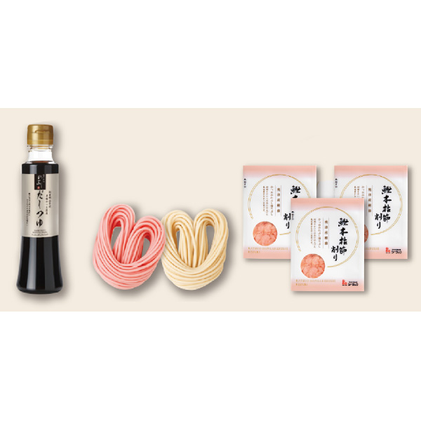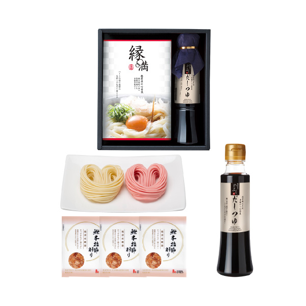 | 内容 | 鰹節屋のだしつゆ200ml×1本、紅ハートうどん×1袋、白ハートうどん×1袋、焼津産かつお本枯節削り×3袋 |