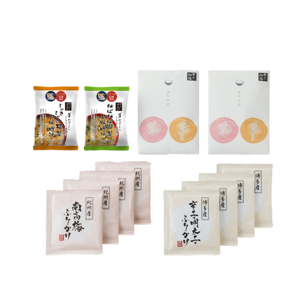・しゃきしゃき根菜のお味噌汁×1袋 ・博多産辛子明太子ふりかけ×4袋 ・紀州産南高梅ふりかけ×4袋 |