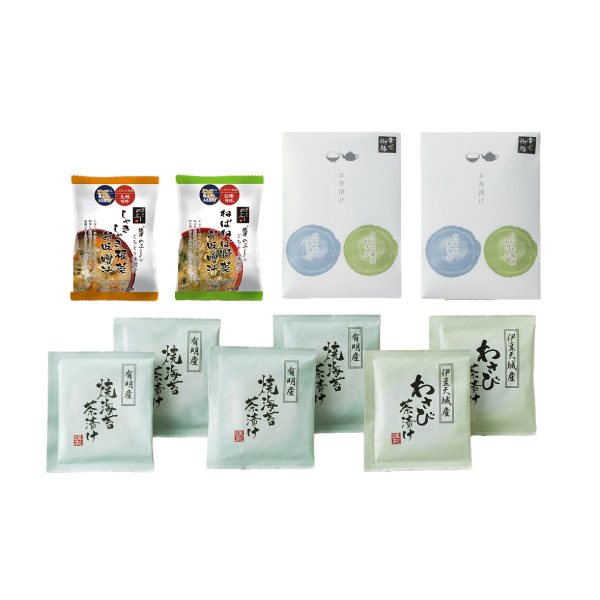 ・しゃきしゃき根菜のお味噌汁×1袋 ・伊豆天城産わさび茶漬け×2袋 ・有明産焼海苔茶漬け×4袋 |