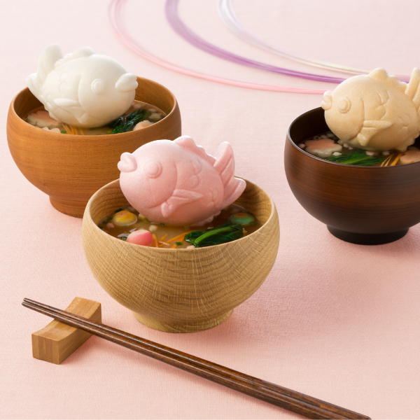 鯛の文字とイラストをポップにあしらったパッケージにかわいいと感謝の気持ちを込めて。おめで「たい」笑顔を食卓に添えるお味噌汁。「めでたい」に通じる名前を持つことから、縁起のいい魚として愛されてきた鯛。めで鯛最中(赤味噌)、祝い鯛最中(白味噌)の2種類を楽しめるセットとなっており、その姿を愛嬌(あいきょう)たっぷりにかたどった最中が、お椀に注いだお湯にぷかぷか浮かび、食卓に笑顔を届けます。ありがとうハートのふりかけをかければ、心がほっこりします。