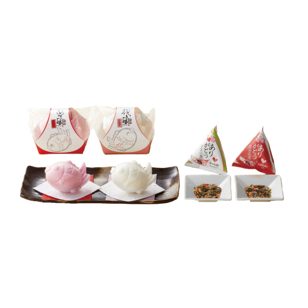 ・祝い鯛最中(白みそ)×1個 ・ありがとうハートのふりかけ (紀州南高梅×1袋、博多明太子×1袋) |