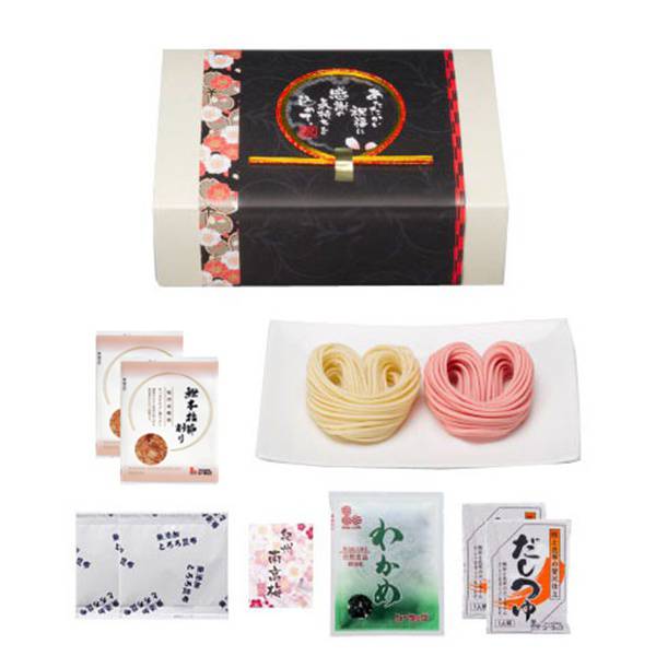 | 内容 | 紅ハートうどん(50g)×1袋、白ハートうどん(50g)×1袋、焼津産鰹本枯節削り×2袋、紀州南高梅×1袋、とろろ昆布×2袋、だしつゆ×2袋、カットわかめ×2袋 |