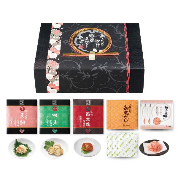 厳選素材で贅を尽くした極上の味。丁寧に仕上げた真鯛茶漬けセット(瀬戸内海産真鯛、調味パック)、やわらかな食感を活かした帆立茶漬けセット(帆立具材、調味パック)、口当たりの良い南高梅茶漬けセット(紀州南高梅、調味パック)と、お茶漬け旨味和風だし、焼津産かつお本枯節削りを贅沢に詰め合わせました。黒を基調としたパッケージには華やかな和柄ときらびやかな水引きを。親族はもちろん、目上の方にも贈りやすいギフトです。