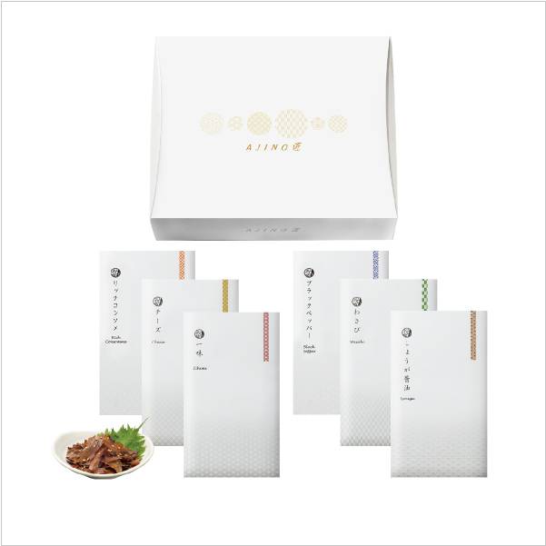| 内容 | 味付削り節(しょうが醤油)×1袋、味付削り節(一味)×1袋、味付削り節(わさび)×1袋、味付削り節(チーズ)×1袋、味付削り節(リッチコンソメ)×1袋、味付削り節(ブラックペッパー)×1袋 |