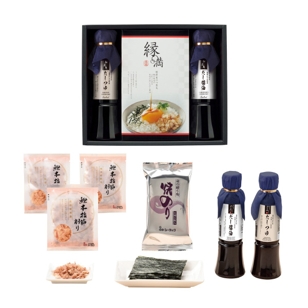 | 内容 | 鰹節屋のだし醤油200ml×1本、鰹節屋のだしつゆ200ml×1本、焼津産かつお本枯節削り×3袋、焼のり8切×1袋 |
