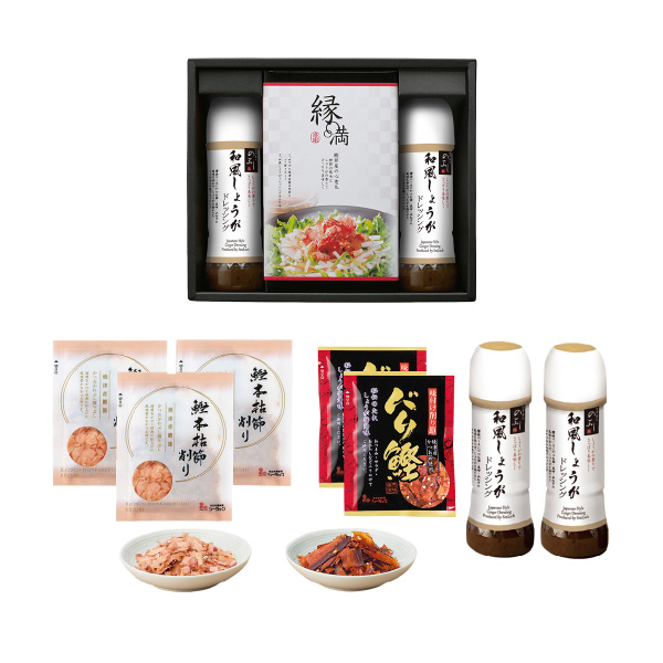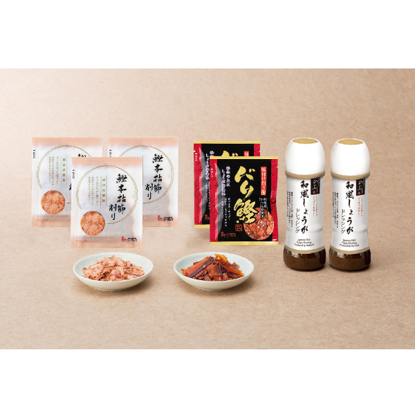 | 内容 | 鰹節屋の和風しょうがドレッシング190ml×1本、焼津産かつお本枯節削り×3袋、バリ鰹(味付削り節)×2袋 |