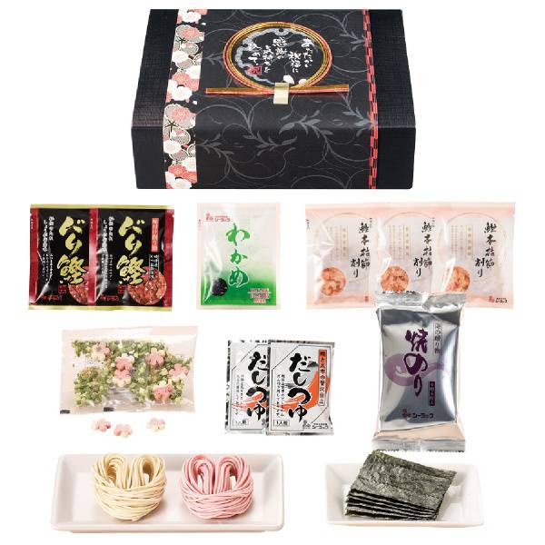 | 内容 | 紅ハートうどん×1袋、白ハートうどん×1袋、焼津産鰹本枯節削り×3袋、バリ鰹(味付削り節)×2袋、だしつゆ×2袋、焼のり六ツ切×1袋、乾燥わかめ×1袋、薬味(焼麩・小ねぎ・香りごま)×2袋 |