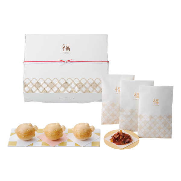 | 内容 | ふく最中(おしるこ)×3個(もち・紅白あられ・あずき入)、味付削り節(しょうが醤油味)×3袋 |