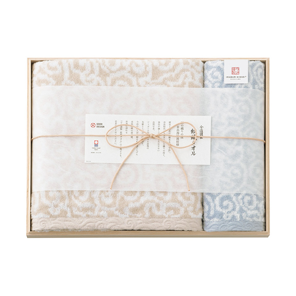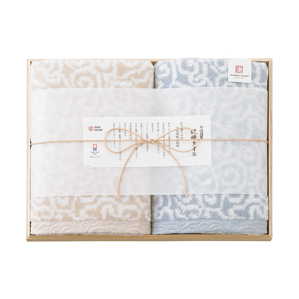 あたたかな春に咲かせる藤とすみれを伝統色で織り上げた繊細で美しいタオル。丁寧な印象が伝わる木箱で贈るギフトです。目上の方への贈り物としておすすめです。