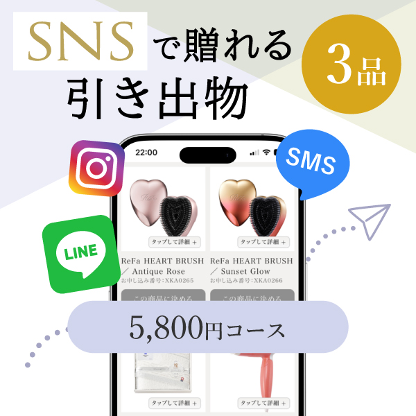 SNSで贈れる引き出物で大切なあの人へ、感謝の気持ちを届けませんか?いつでも、どこでも、スマホ1つで簡単に♪SNSやLINEを通じてゲストごとにURLとパスワードを送るだけで、お好みの記念品・引き菓子などを選んでいただける引き出物スタイルです。
