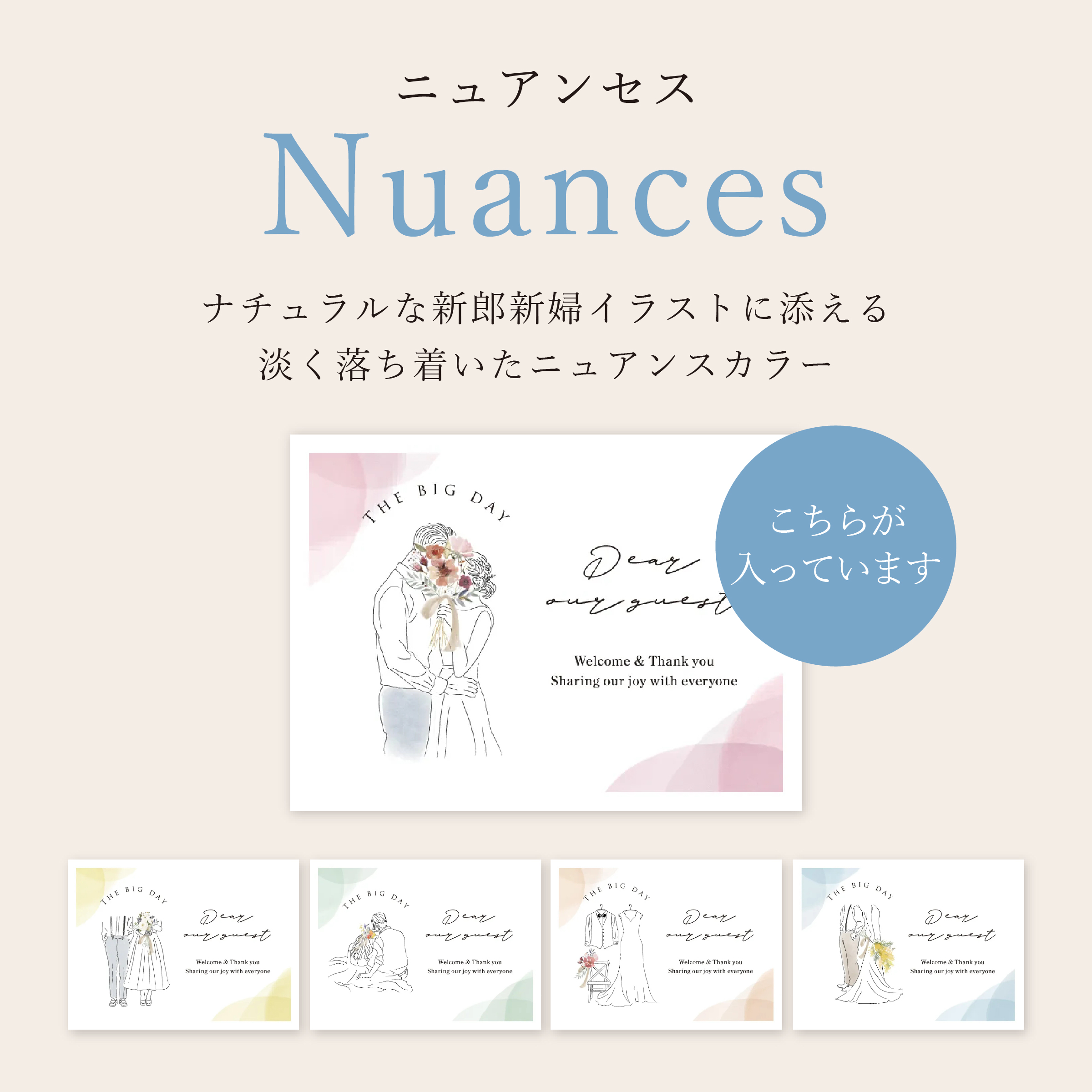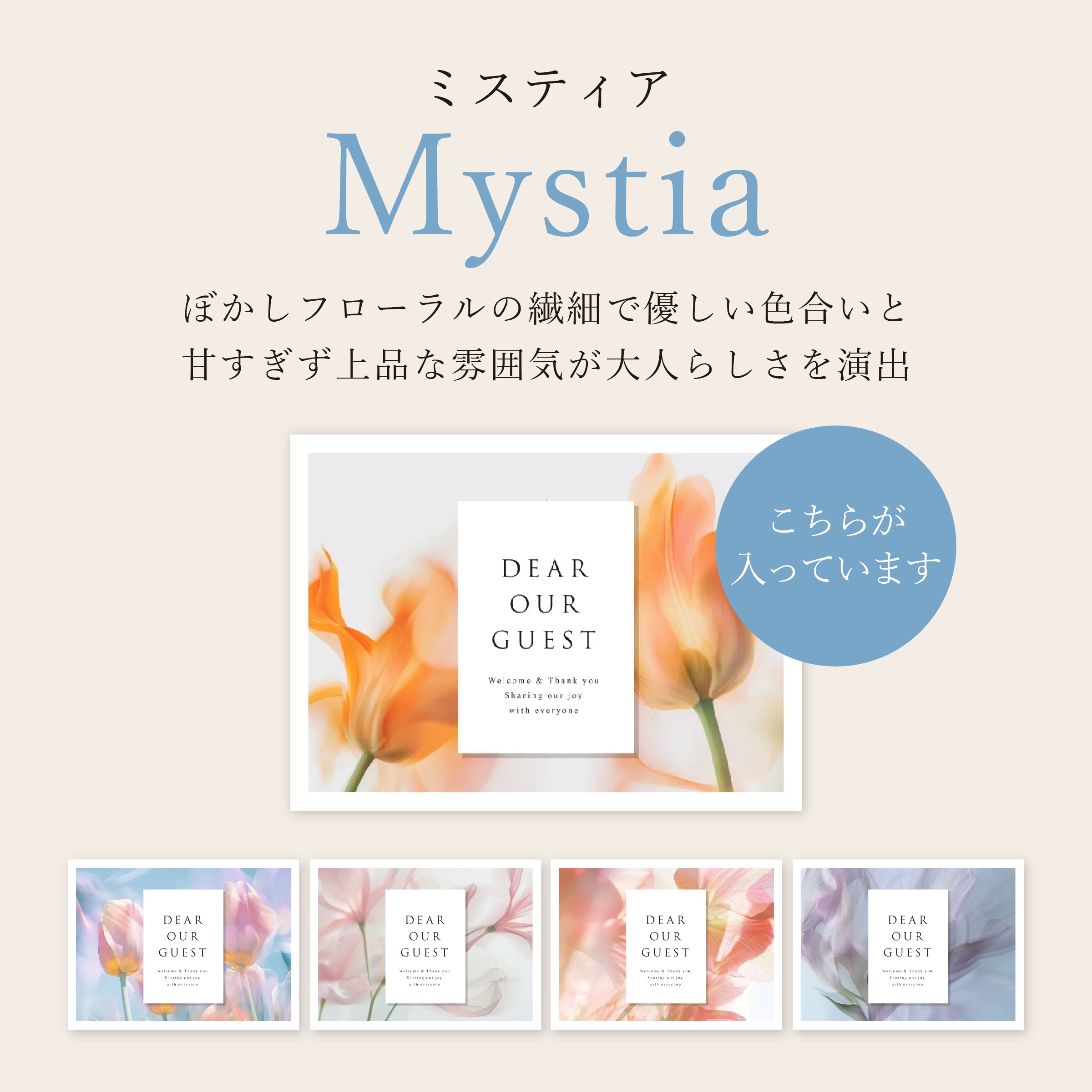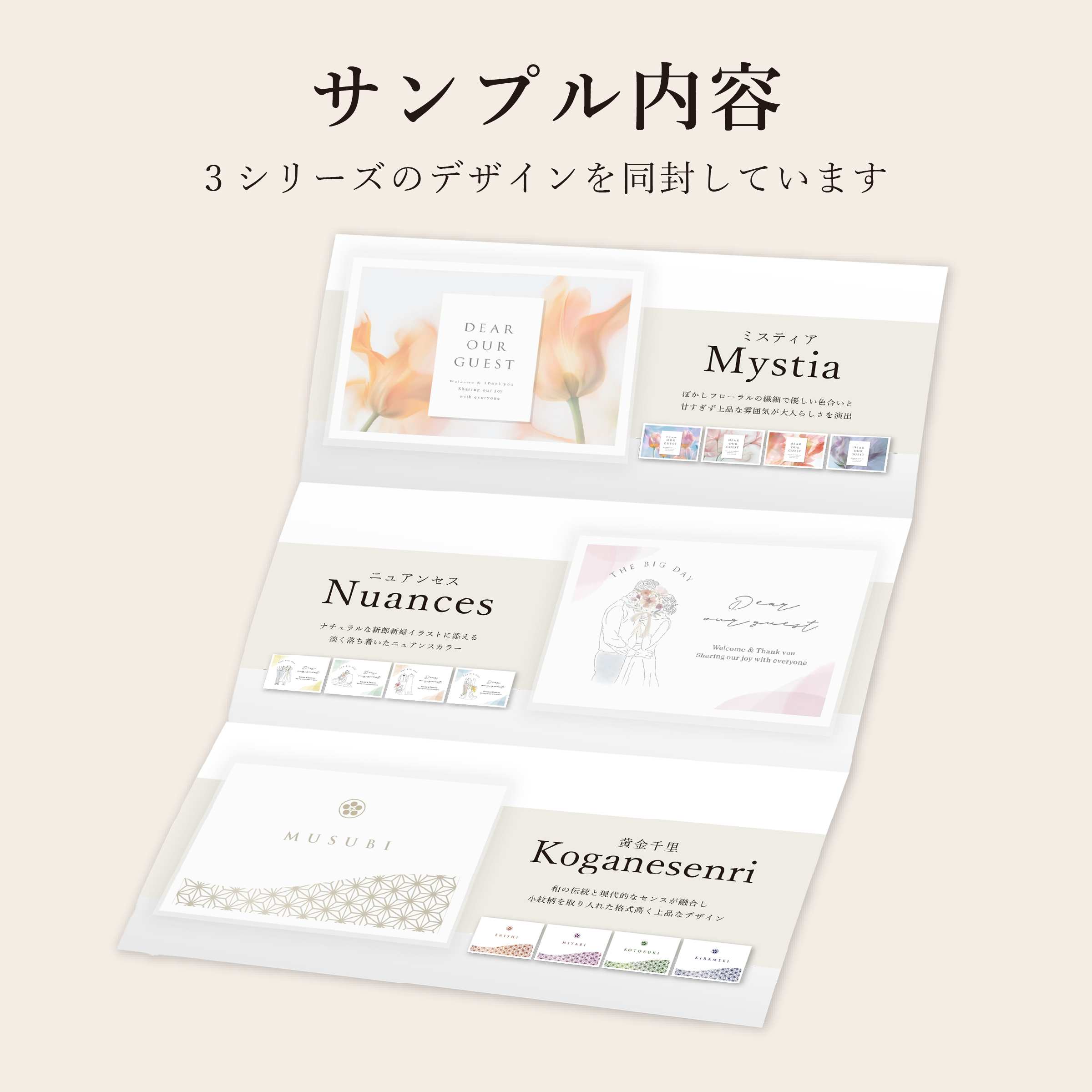 2人に1人の花嫁に選ばれるPIARYだからこそ叶えられた、ハイクオリティ×低価格の新しい引き出物カード「シアー」。QRコードを読み取るだけで、ゲストが好きな記念品・引き菓子・縁起物を選べるスマートなスタイルです。水彩タッチのぼかしフローラルが上品に華やぎ、どんな結婚式にも調和する「ミスティア」。ナチュラルでおしゃれな新郎新婦イラストと落ち着いたニュアンスカラーが、大人らしいこなれ感を演出する「ニュアンセス」。伝統的な小紋柄と現代的なセンスが融合し、“新たな門出”を象徴する上品で格式高い和モダンデザインの「黄金千里」。全3シリーズの実物デザインを見ることができるのが嬉しいポイント。トレーシングペーパーの透け感や高級感を、ぜひその手でお確かめください。