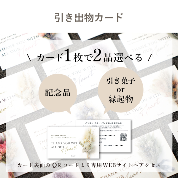「記念品」と「引き菓子」または「縁起物」の【2品】をゲストご自身がお好きなアイテムを選べる引き出物カードです。新郎新婦さまはコースを選ぶだけなので引き出物の準備がスムーズに。お式の当日、ゲストにお渡しするのはコンパクトなパッケージだけなので荷物にならず持ち帰りの負担を軽減してくれます。