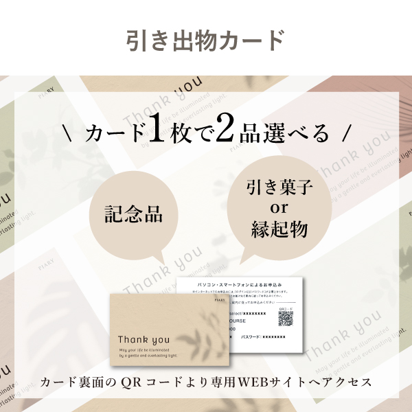 2人に1人の花嫁が使っているPIARYだからこそ実現した、ハイクオリティで圧倒的低価格な引き出物カード。引き出物カードはゲストがカードに印字されたQRコードをスマホで読み取り、お好みの記念品・引き菓子などを選んでいただける引き出物スタイル。トレンド感溢れるカードデザインはもちろん、持ち帰りに便利な手提げ袋などゲストへの気遣いもばっちり。ブランシュは結婚式準備をよりスマートに、ゲストへのおもてなしも同時に叶えてくれます。