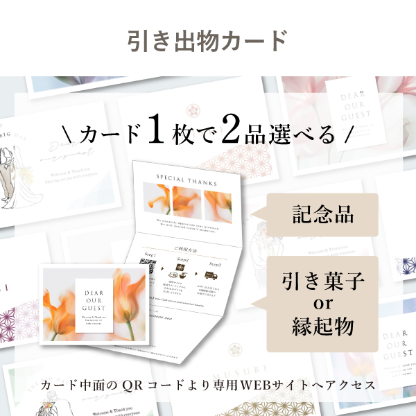 2人に1人の花嫁に選ばれるPIARYだからこそ実現した、ハイクオリティかつ圧倒的な低価格の引き出物カード。引き出物カードは、ゲストカードに印字されたQRコードをスマートフォンで読み取るだけで、お好みの記念品や引き菓子などを選んでいただける新しい引き出物のスタイルです。トレンド感あふれるカードデザインはもちろん、持ち帰りに便利な手提げ袋など、ゲストへの心遣いも万全。シアーは、結婚式の準備をよりスマートにしながら、ゲストへのおもてなしも同時に叶えます。