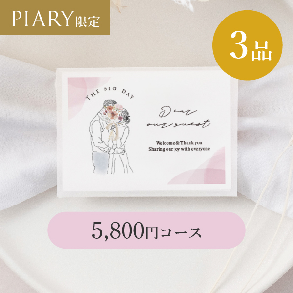 5,800円コースは、記念品3,000円、引き菓子1,000円、縁起物1,000円の3品セットです。友人・同僚の方におすすめのコースとなっています。