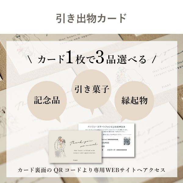 「記念品」「引き菓子」「縁起物」の【3品】をゲストご自身がお好きなアイテムを選べる引き出物カードです。新郎新婦さまはコースを選ぶだけなので引き出物の準備がスムーズに。お式の当日、ゲストにお渡しするのはコンパクトなパッケージだけなので荷物にならず持ち帰りの負担を軽減してくれます。