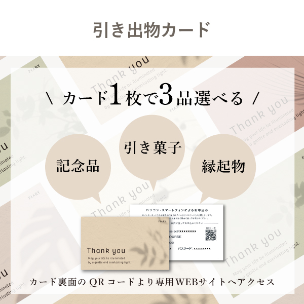 2人に1人の花嫁が使っているPIARYだからこそ実現した、ハイクオリティで圧倒的低価格な引き出物カード。引き出物カードはゲストがカードに印字されたQRコードをスマホで読み取り、お好みの記念品・引き菓子などを選んでいただける引き出物スタイル。トレンド感溢れるカードデザインはもちろん、持ち帰りに便利な手提げ袋などゲストへの気遣いもばっちり。ブランシュは結婚式準備をよりスマートに、ゲストへのおもてなしも同時に叶えてくれます。