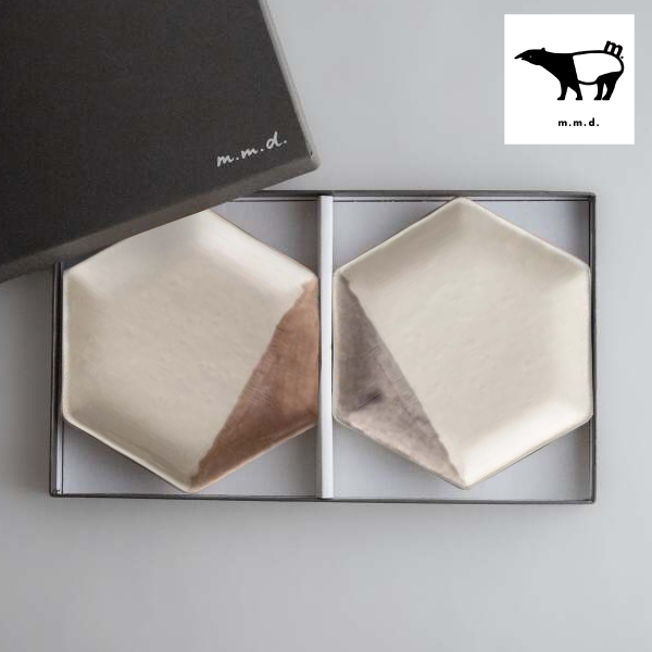 縁起の良いモチーフとして古くから親しまれている「六角形」取り皿のギフトです。 瀬戸焼の「掛け分け」という伝統的な技法を用いて製作し、色のついた部分を寄り添うように並べて、「末広がり」の八の字に見立てました。