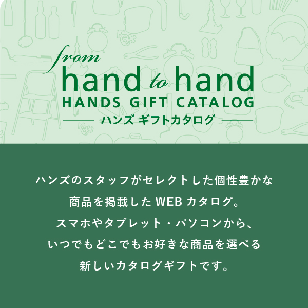 from hand to handは、ハンズスタッフがセレクトした商品を集めたカタログギフト。スマホやタブレット・パソコンから、お好きな商品がいつでもどこでもお選びいただけるカード型カタログギフトです。