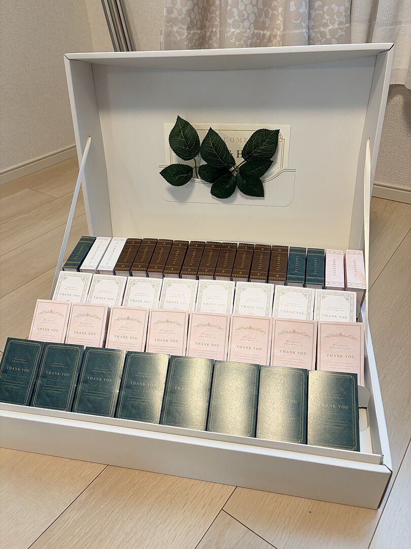 大きい外箱は出来上がった状態で届きます! 別包装のクッキーの箱を並べるだけで、ウェルカムスペースに置けました! サイズ感も良く、アンティークな会場にぴったりでした! 味見用に多めにクッキー買いましたが、美味しかったです! プチギフトとしてお渡しした際もゲストが喜んでくれました!