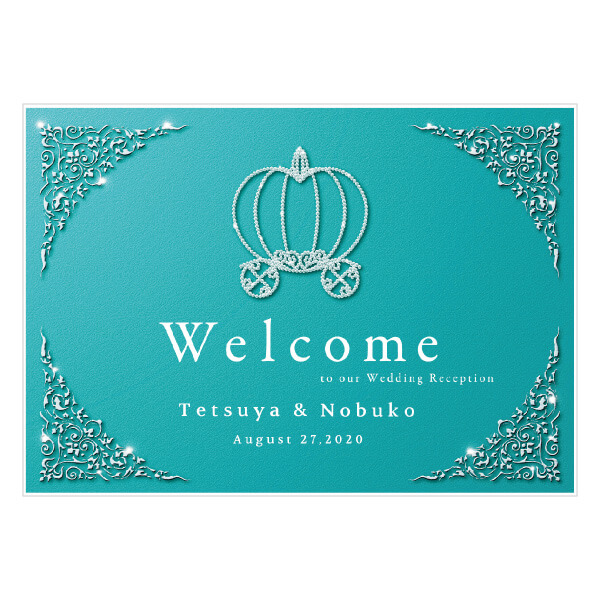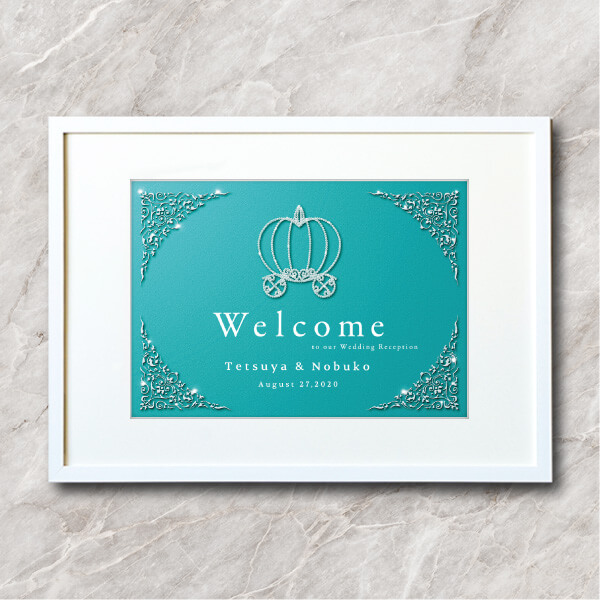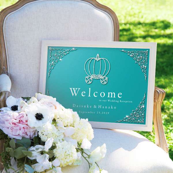 おふたりのアイディア次第で素敵なウェルカムボードに大変身♪鮮やかなブルーが印象的な、シンプルなウェルカムボードはかぼちゃの馬車のデザインがポイント。