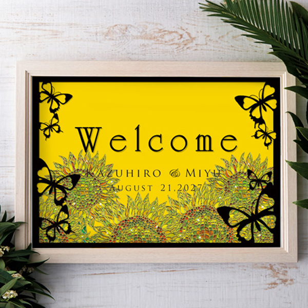 おふたりのアイディア次第で素敵なウェルカムボードに大変身♪鮮やかなイエローが印象的な、向日葵と蝶のウェルカムボード。明るいおふたりを連想させる、素敵なデザインです。