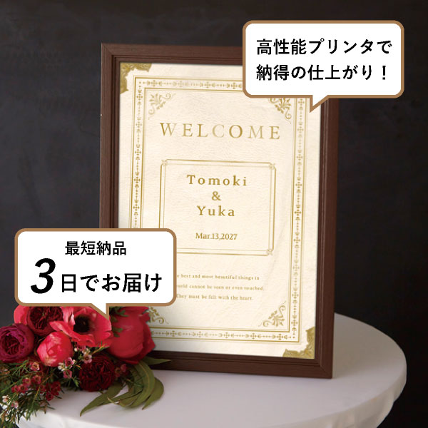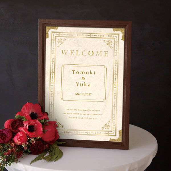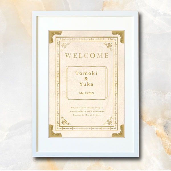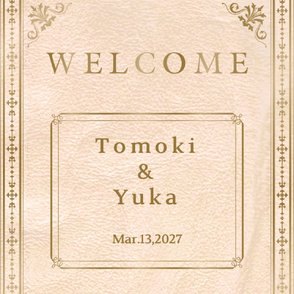 温もりのあるアンティーク調デザインのウェルカムボードです。ホワイトをベースとした洋書風のデザイン。お洒落さと落ち着き感を兼ね備えたデザインが、おふたりの物語が始まるワクワク感があり、グッと洗練された印象へと変わり特別な空間を演出してくれます。ゴールドの文字が上品で高級感が溢れる素敵な空間へ。大人でシックな雰囲気でロマンチックに会場内を包み込みます。