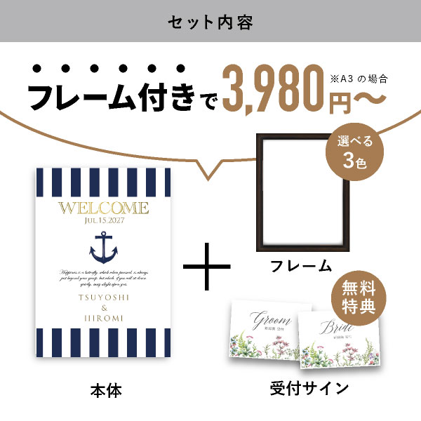 | 無料特典 | 受付サイン1組(新郎用×1組、新婦用×1組) |
