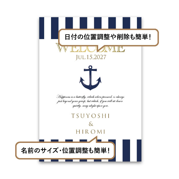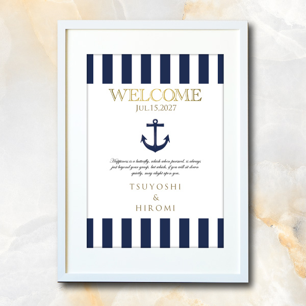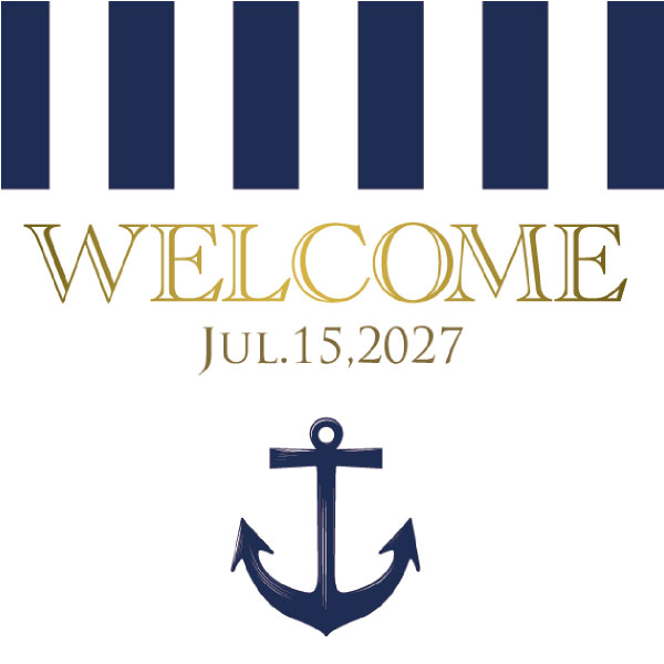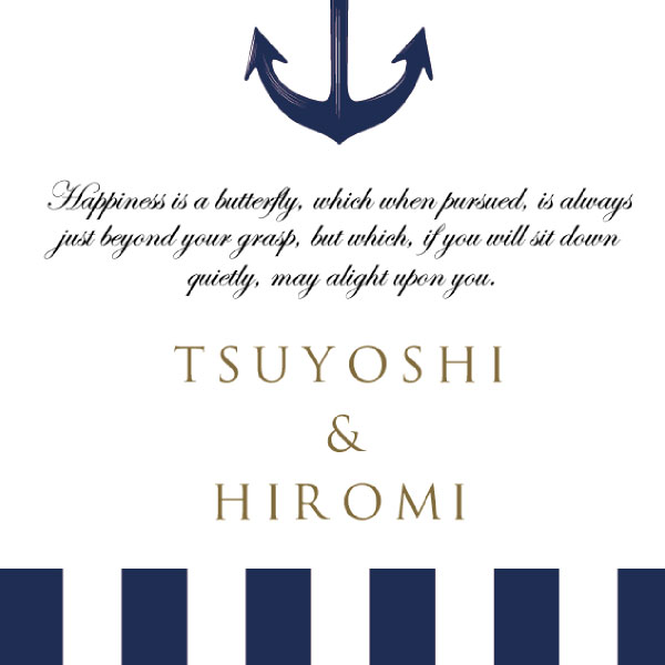 印象的なブルー×ホワイトのストライプは、夏の青い海と白い砂浜、英文のデザインは上品にリッチ感、イカリマークはおふたりがこれから歩む未来を出航するかのような豪華客船を連想させます。