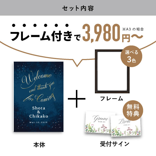 | 無料特典 | 受付サイン1組(新郎用×1組、新婦用×1組) |