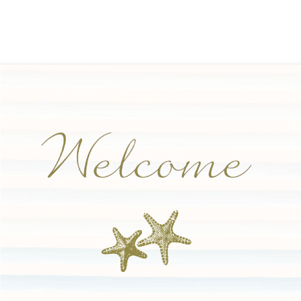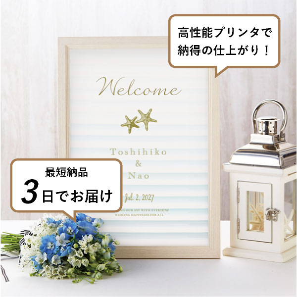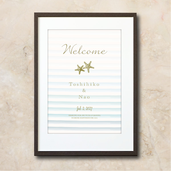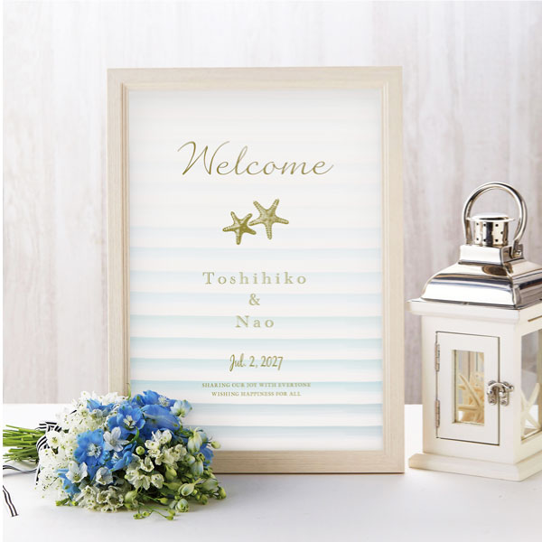 きれいなブルーグラデーションがどこまでも続く美しく澄んだ海のよう。リゾートの海辺を連想させる爽やかなデザインです。水彩のように描かれた波のグラデーションにヒトデが可愛らしさをプラス。さりげないゴールドの箔押しがちょっぴり高級なリッチ感を演出しています。ヒトデはハワイでは海の流れ星と呼ばれ、「夢が叶う」や「輝き続ける」と表現されており、身につける時に「ひとつ願いを込めると叶う」といわれています。 また、ヒトデは切られても再生する強い生命力を持つことから「魔除け」としてお守りにもなっています。夏や海が大好きなおふたりはもちろん、サマーウェディングに使いたいウェルカムボードです。