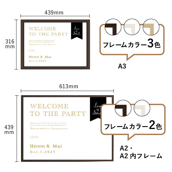 | 内容物 | ■グラフィックウェルカムボード ■フレーム付き(A3サイズは3種類よりお選びいただけます。A2サイズは2種類よりお選びいただけます。)  |