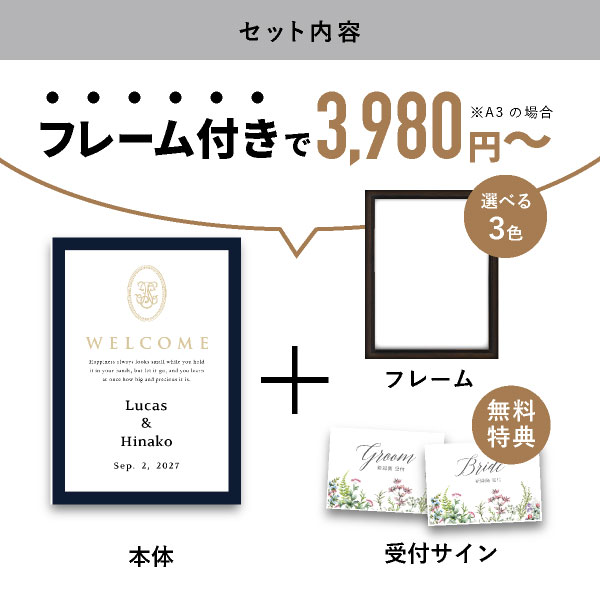 | 無料特典 | 受付サイン1組(新郎用×1組、新婦用×1組) |