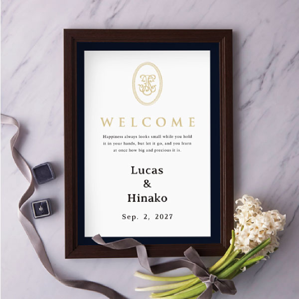 格式高いロイヤルブルーを基調とした、シンプルリッチな大人ウェディングを演出するウェルカムボードです。洗練されたスタイリッシュなデザインは正統派ウェディングを叶えてくれる1枚です。