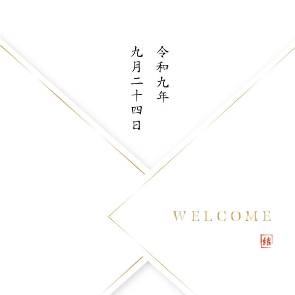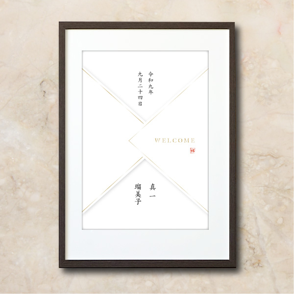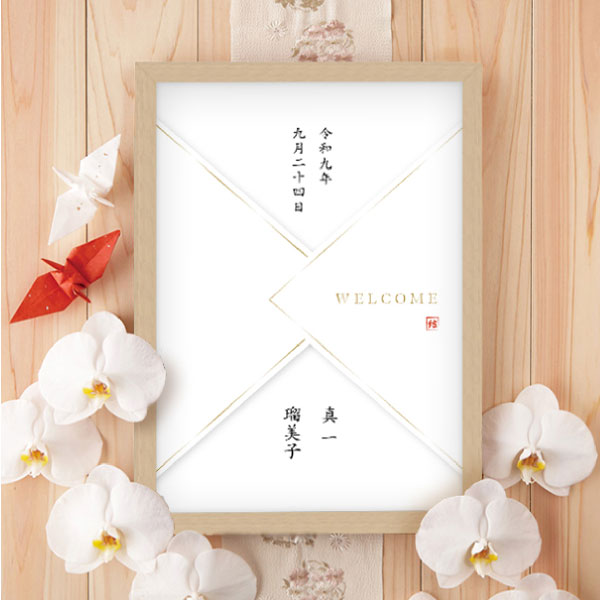 名前のとおり和装の代表格「白無垢」をイメージしたデザイン。厳かな時の始まりを思わせる上品で重厚感のある雰囲気を演出してくれるウェルカムボードです。新たな門出への感謝と喜びをこの一枚に込めて…。