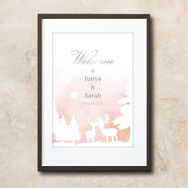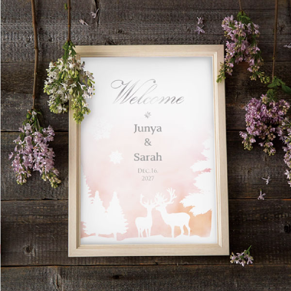 真っ白な雪景色の中にたたずむ二匹のトナカイからイメージするのは幸せなおふたりの姿。水彩のようなやさしいタッチがこれから始まる結婚式への期待感をアップさせます。クリスマスシーズンの結婚式におすすめです。