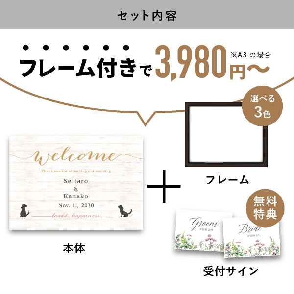| 無料特典 | 受付サイン1組(新郎用×1組、新婦用×1組) |