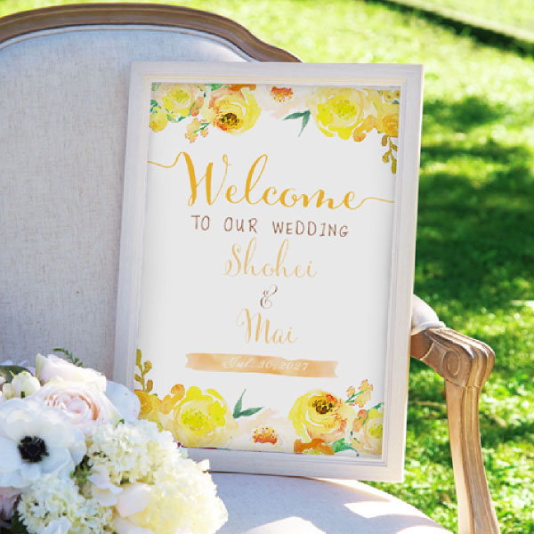 ウォーターカラーの色鮮やかなイエローフラワーが印象的なウェルカムボードです。エレガントでちょっぴり甘めな雰囲気を演出してくれます。春にはもちろん、初夏やシンプルな結婚式にもおすすめです。ガーデンウェディングにもぴったりの一枚。