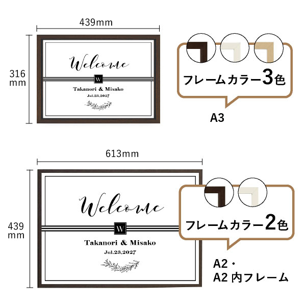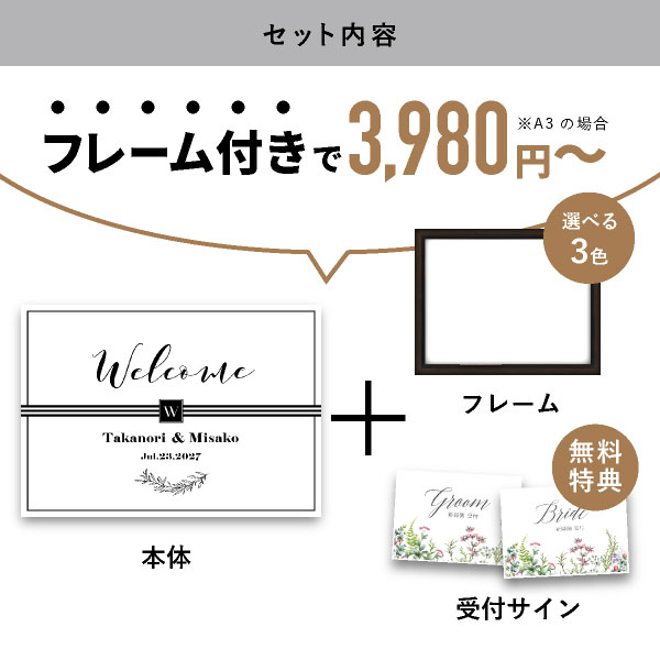 | 内容物 | グラフィック ウェルカムボード ■フレーム付き(A3サイズは3種類よりお選びいただけます。A2サイズは2種類よりお選びいただけます。) |