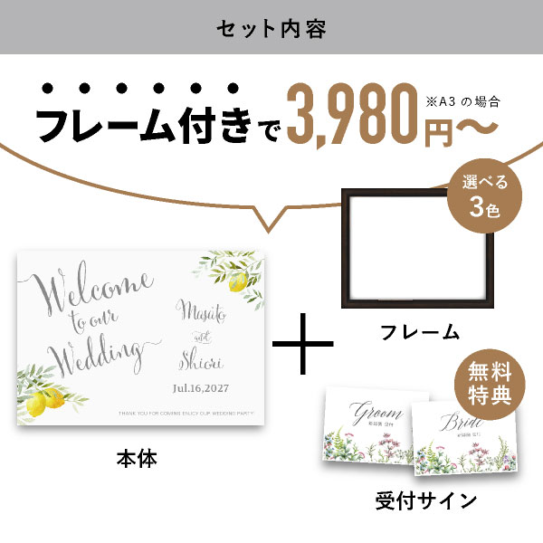 | 無料特典 | 受付サイン1組(新郎用×1組、新婦用×1組) |