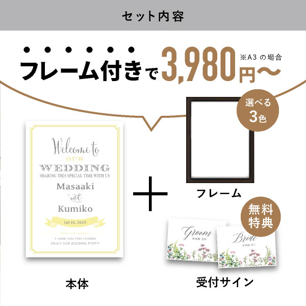 | 無料特典 | 受付サイン1組(新郎用×1組、新婦用×1組) |
