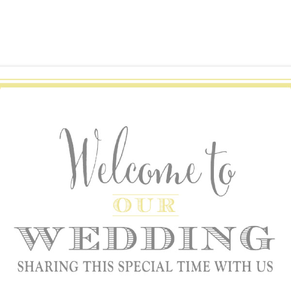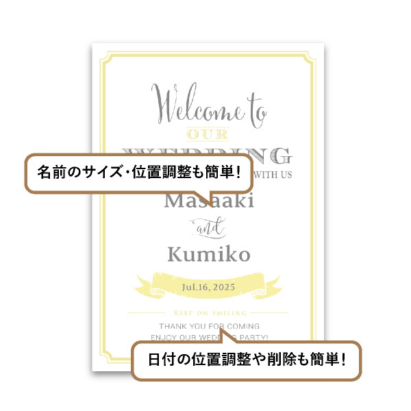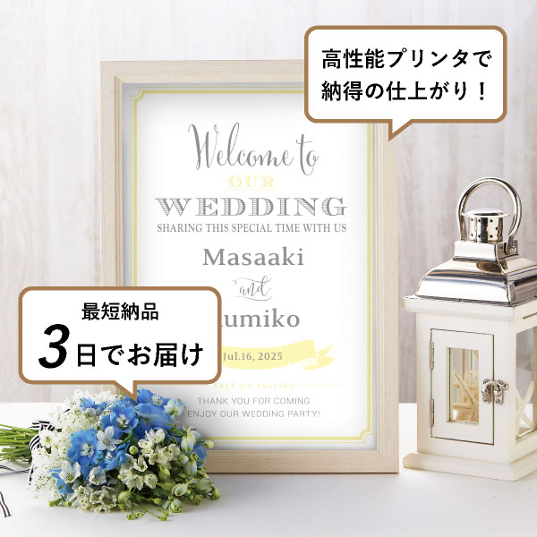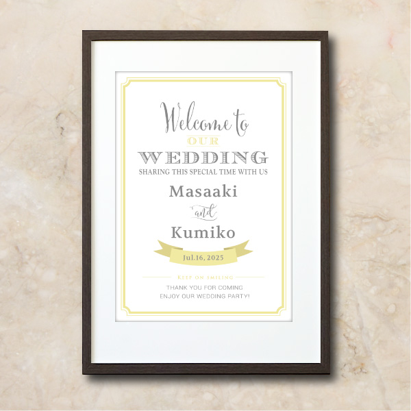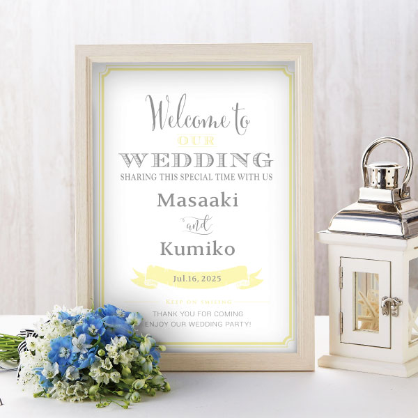 鮮やかなイエローカラーが印象的なデザインのウェルカムボードです。様々なフォントを使ったデザインがシンプルでありながら、センスを感じる一枚です。