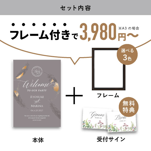 | 内容物 | グラフィック ウェルカムボード ■フレーム付き(A3サイズは3種類よりお選びいただけます。A2サイズは2種類よりお選びいただけます。) |