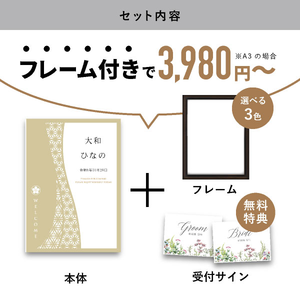 | 内容物 | グラフィック ウェルカムボード ■フレーム付き(A3サイズは3種類よりお選びいただけます。A2サイズは2種類よりお選びいただけます。) |
