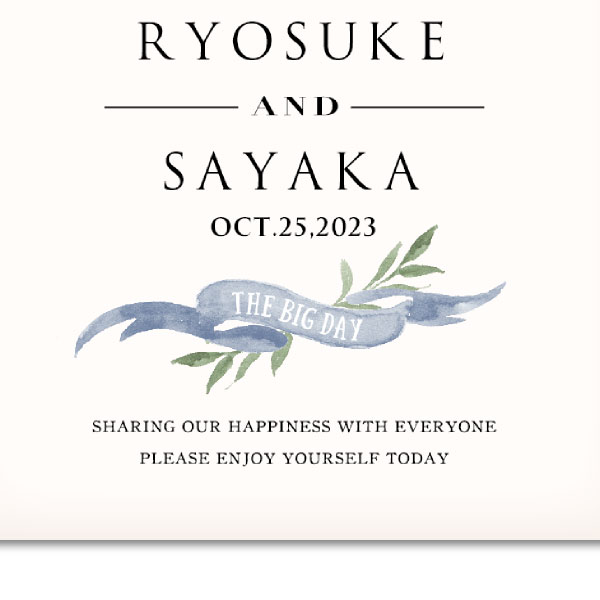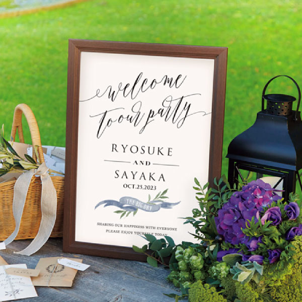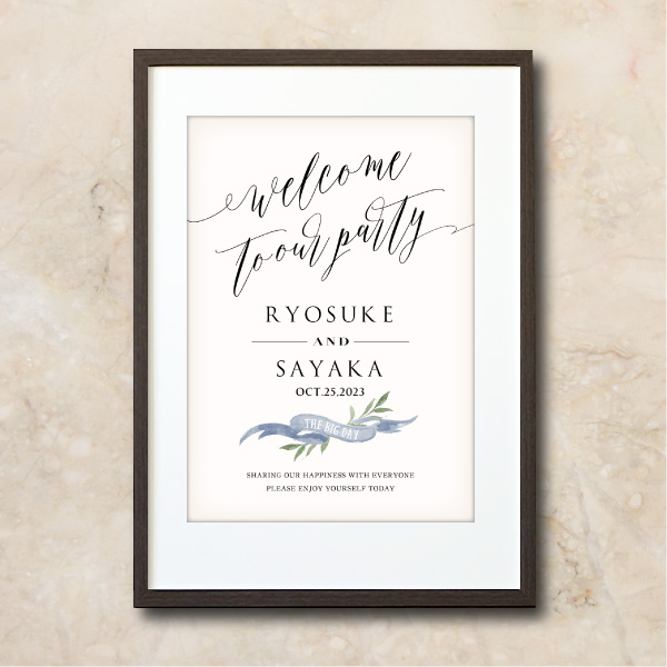 上品で凛としたブルーリボンが目を引くデザイン。センスを感じるカリグラフィーがウェルカムスペースをおしゃれに演出します。