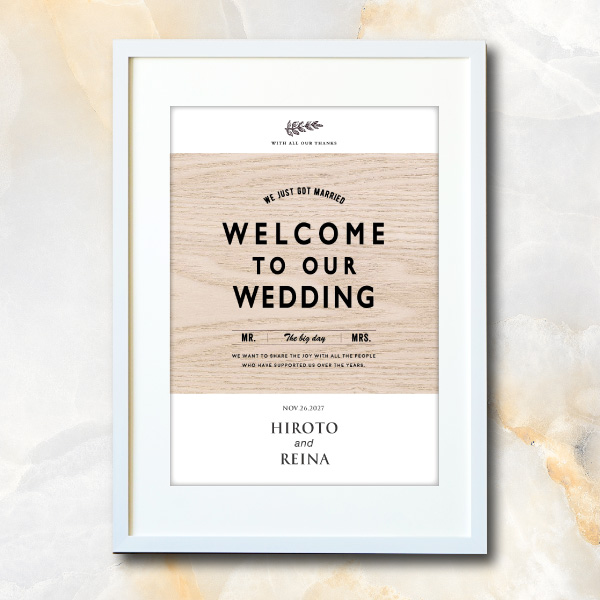 美しい木目調のデザイン、おふたりのこれまでの軌跡。今日という日を迎えられた喜びが溢れ出す一枚。ナチュラル・カジュアル・ガーデンウェディングにおすすめです。