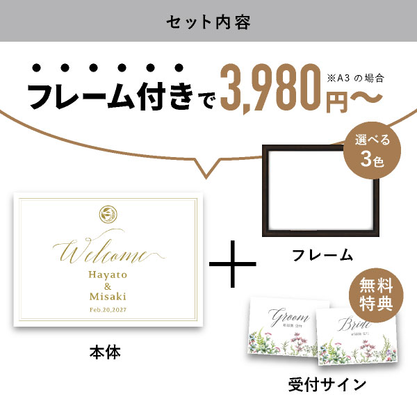 | 内容物 | グラフィック ウェルカムボード ■フレーム付き(A3サイズは3種類よりお選びいただけます。A2サイズは2種類よりお選びいただけます。) |